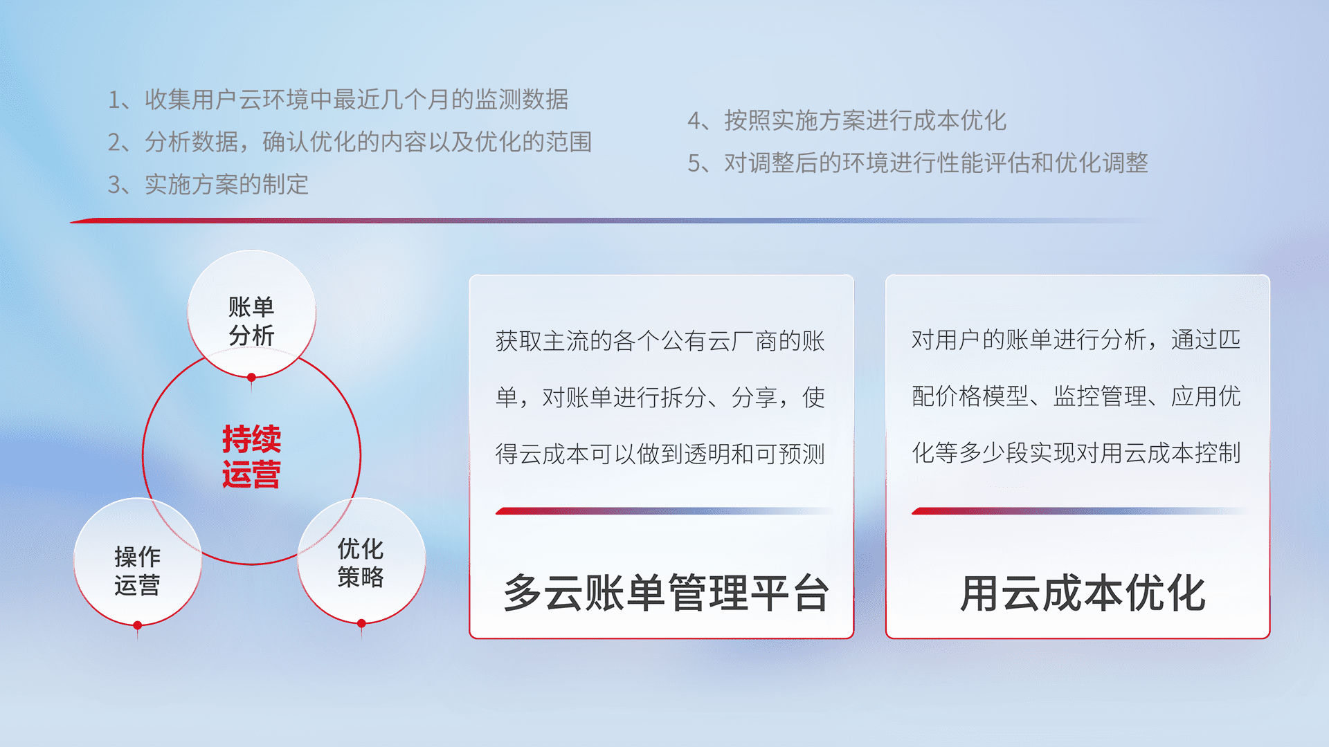 通过多云纳管,,,以统一的资源数据模型把客户的云资源进行抽象和封装,,进而实现对多云资源的统一操作,,,保障云资源管理的可靠性、、、稳定性与可用性。。。量身定制化运维内容,,,,配置、、开发运维、、、、补丁管理、、、备份、、监控、、、、认证和访问管理、、、、审计和日常巡检等,,,保障在用云过程中的可靠度,,,,稳定度以及高可用率。。。。