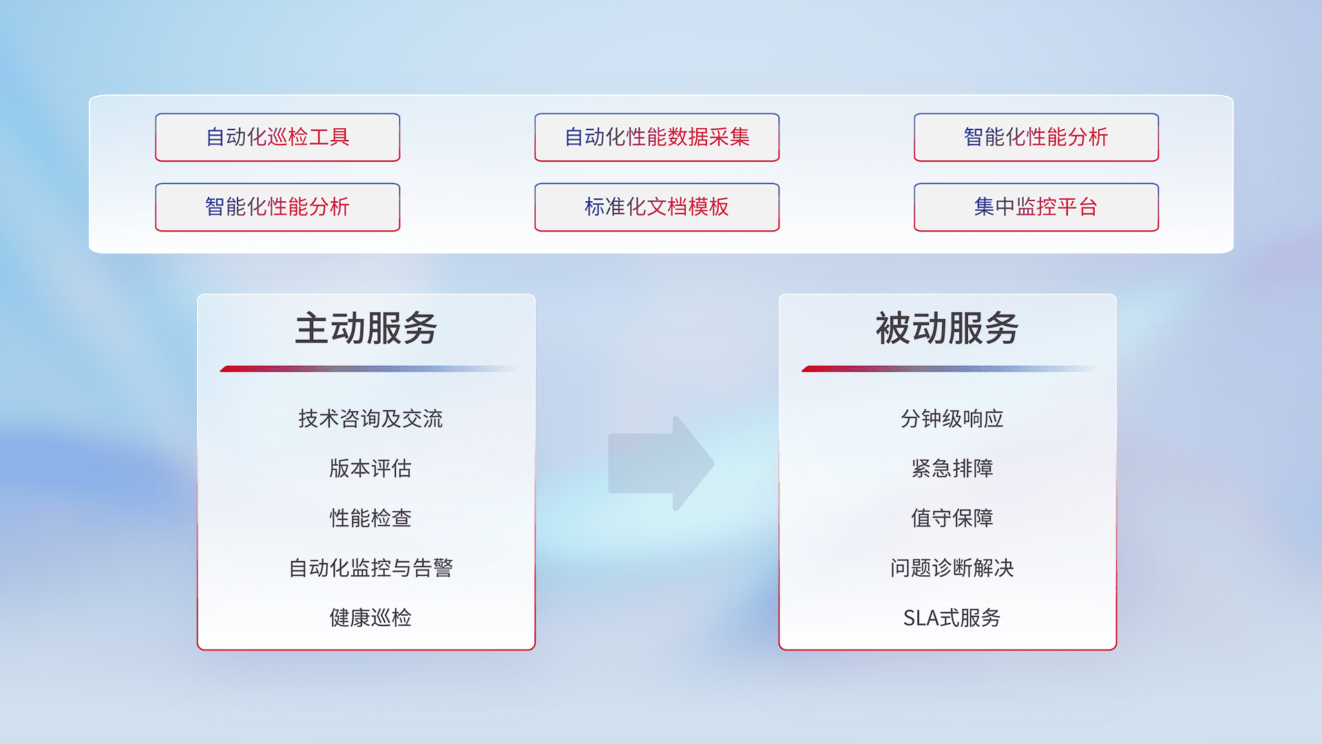 智能化工具和标准化文档,,,保障服务质量,,,提供主动服务(包含技术咨询、、、、版本评估、、性能检查、、、、自动化监控与告警、、健康巡检)和被动服务包含(分钟级响应、、紧急排障、、值守保障、、、问题诊断解决、、、、SLA服务)。。